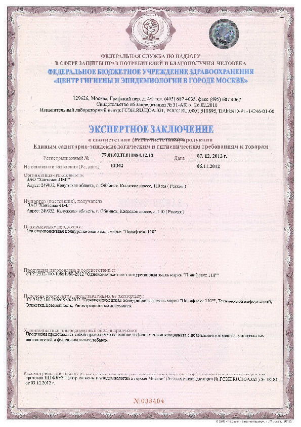 | Внешний вид | Однородная окрашенная суспензия. Цвет: согласно карте цветов «Хантсманг-НМГ» или RAL K7 | |