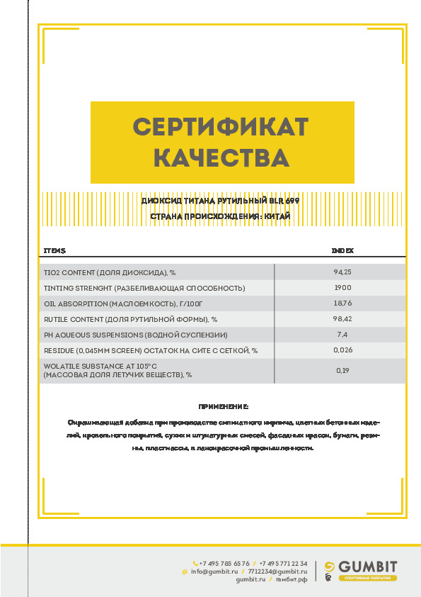 Белый краситель используют для окрашивания резиновой крошки в белый цвет и для коррекции оттенка других пигментов. Порошкообразное вещество смешивают с гранулятом и полимерным клеем в миксере, доводя рабочую смесь до однородной консистенции. Буквально через несколько минут у вас будет готова масса равномерно белого оттенка. Останется лишь уложить её на подготовленное основание и дождаться полимеризации состава. Таким же образом белый пигмент смешивают с остальными красителями для резиновой крошки.